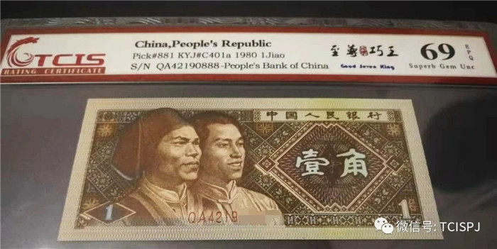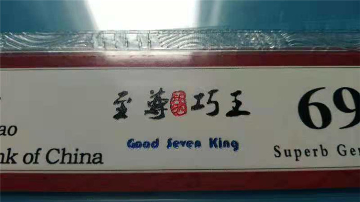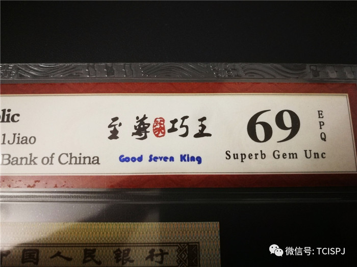 2)至尊“柒”巧王,為什么標(biāo)名中間帶含“柒”字紅色特殊印章,首先為設(shè)計理念:常規(guī)來說紙幣收藏界俗稱8001七巧板,說明七個位置巧妙,至尊“柒”巧王不僅僅七個地方巧妙!再者中國人喜歡無“4、7”所以名字不能念“七”。為了將標(biāo)識名稱大眾化,隱“七”保王。把“七”巧妙轉(zhuǎn)化為中國元素:把大寫中文“柒”字以紅色印章顯示再呈現(xiàn)在相應(yīng)位置上,突出重點“巧”。該圖形設(shè)計在所有國評評級公司中是很好的,旨在弘揚中國傳統(tǒng)文化,采用中國傳統(tǒng)文字。印章“柒”具中國特色,采用大師級手繪加鏤空設(shè)計,端莊大方、獨樹一幟,同時具有極強防偽功能。